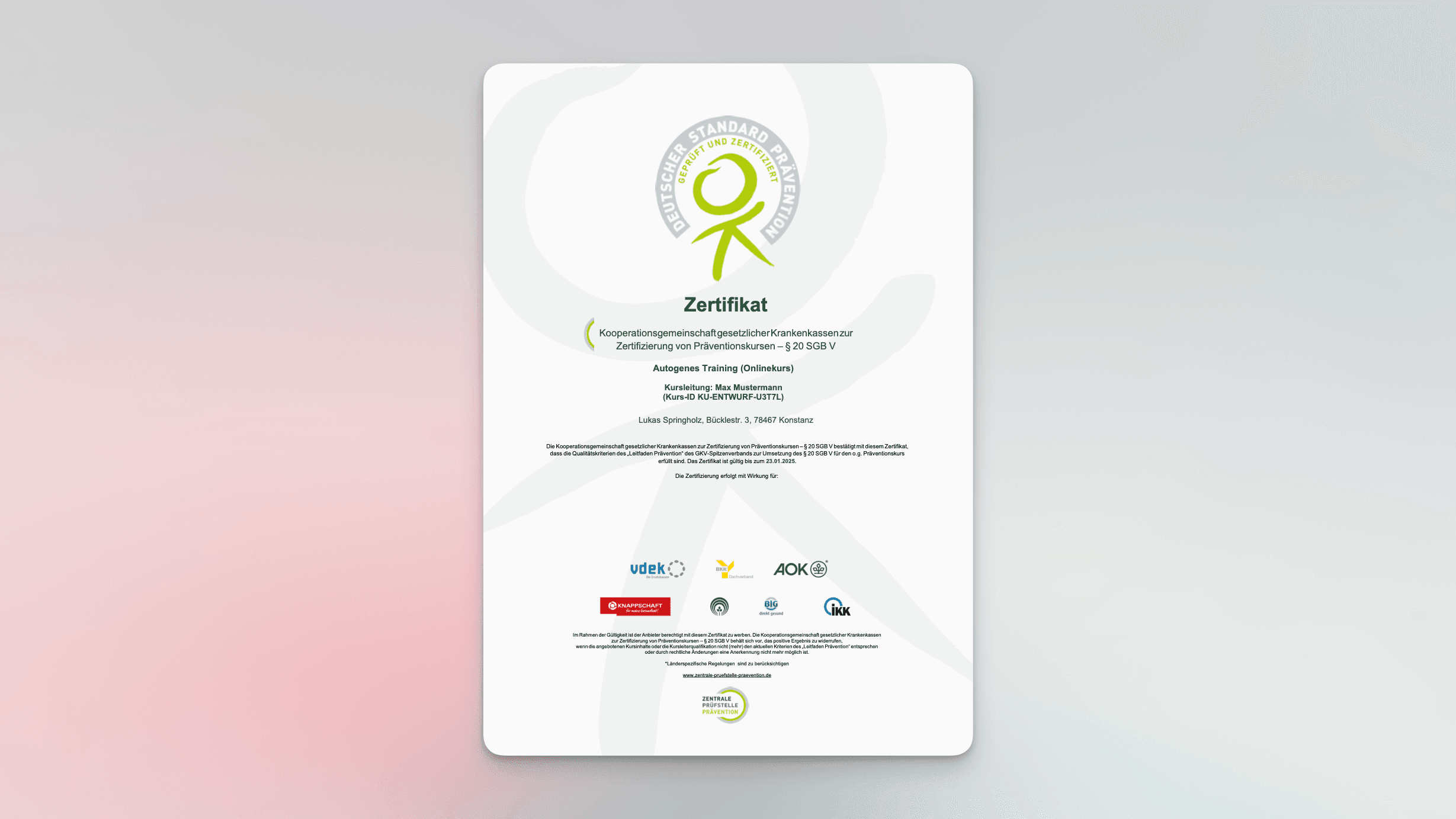 Deine Krankenkasse hat ein großes Interesse daran, dass du gesund bleibst. Deshalb fördern gesetzliche Krankenkassen zertifizierte Präventionskurse, die dir dabei helfen, gesund zu bleiben. Unser Kursangebot ist von der Zentralen Prüfstelle Prävention (ZPP) zertifiziert und wird von allen gesetzlichen Krankenkassen anerkannt. Das bedeutet, dass du nach erfolgreicher Teilnahme am Kurs deinen Zuschuss von der Krankenkasse unkompliziert zurückbekommst. Reiche einfach deine Teilnahmebestätigung bei deiner Krankenkasse ein. Ganz einfach und ohne Vorantrag.